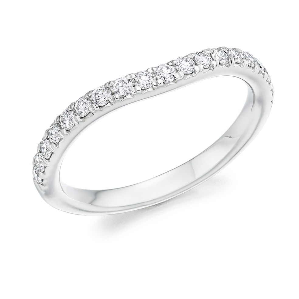 Ladies platinum wedding ring with round brilliant cut diamonds set in a pavé setting.
