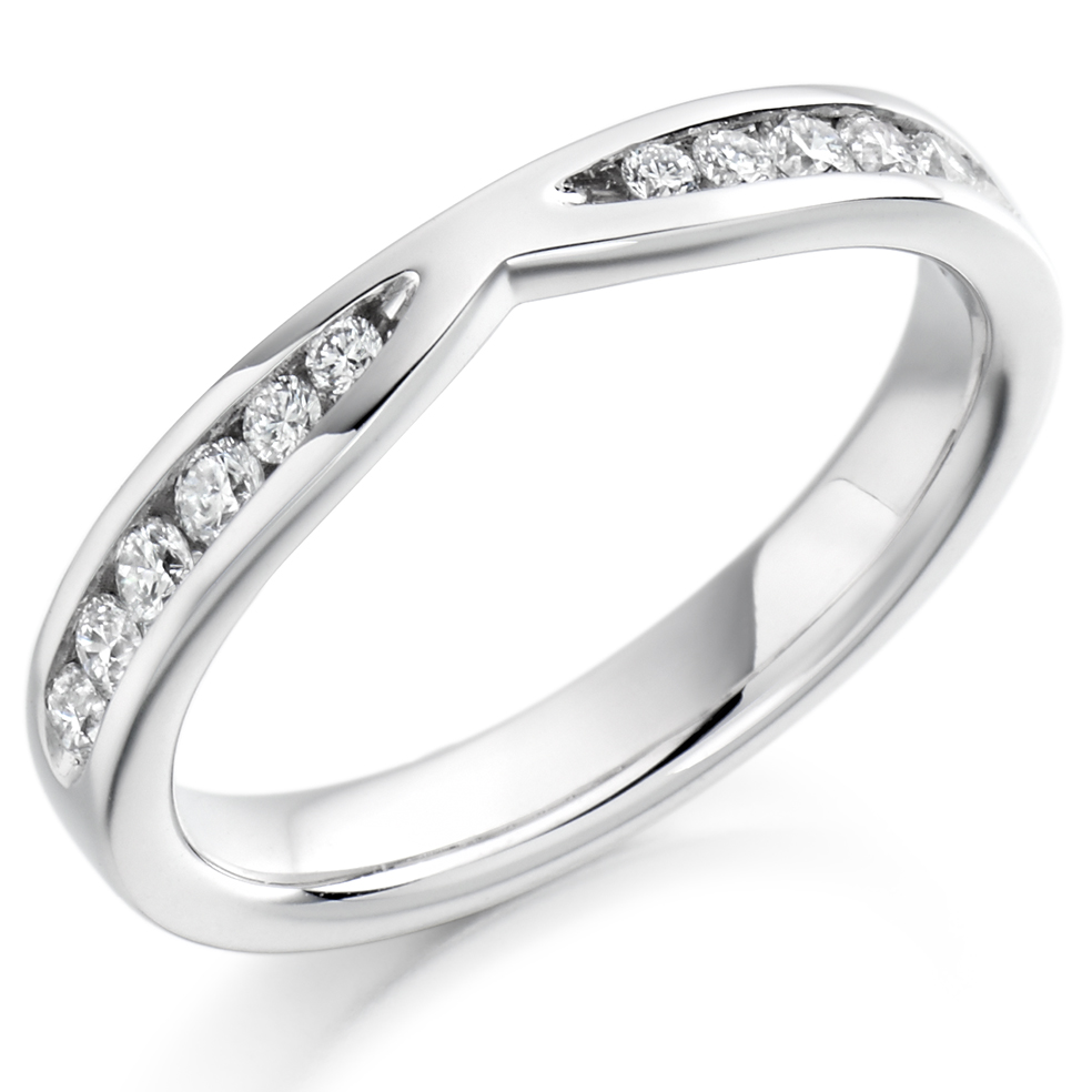 Ladies platinum cut-out wedding ring with round brilliant cut diamonds set in a channel setting with a straight edge.