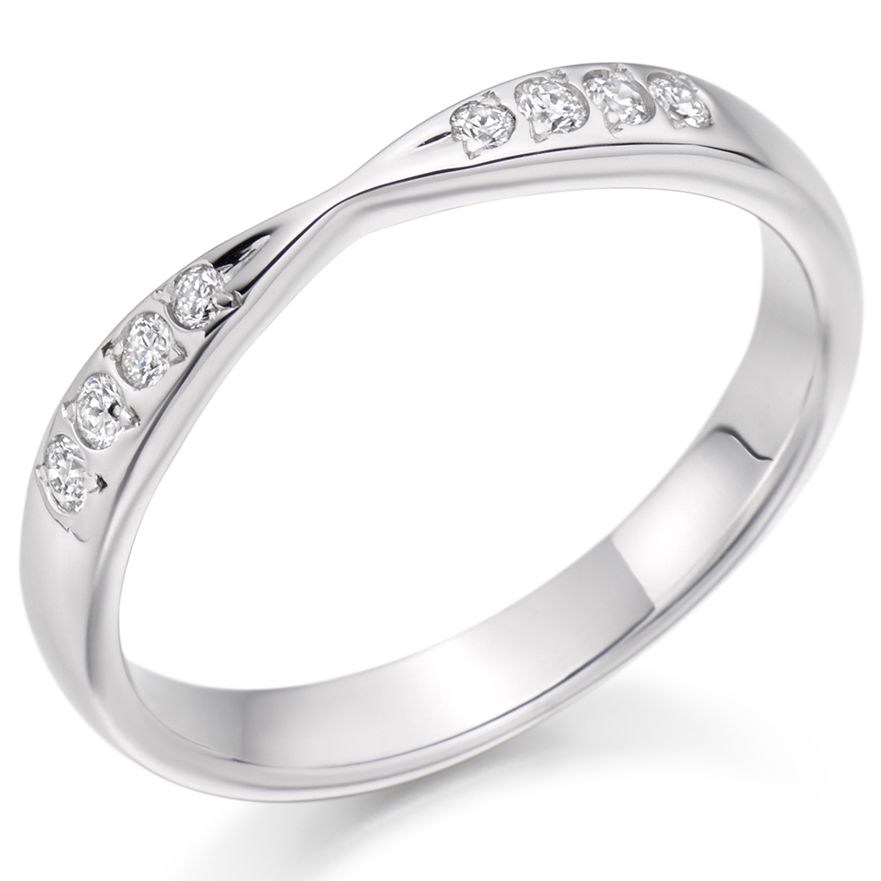 Ladies platinum cut-out wedding ring with round brilliant cut diamonds set in a grain setting.
