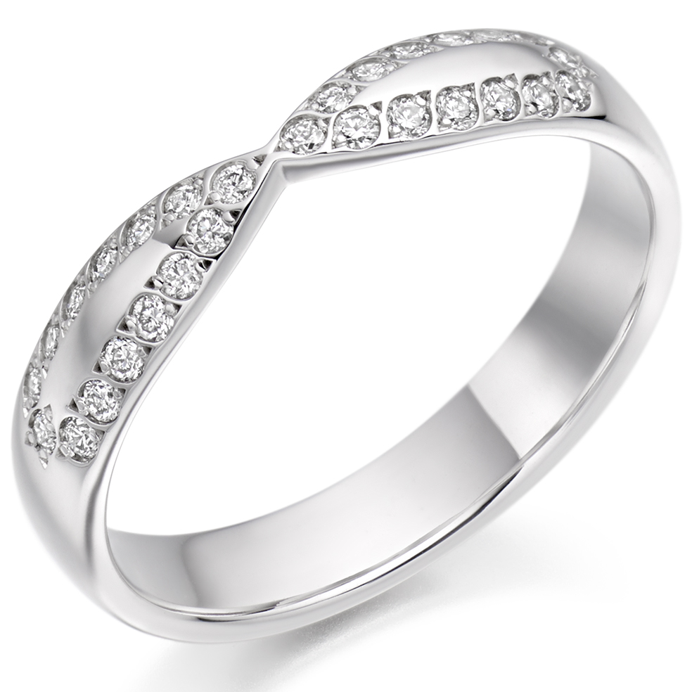 Ladies platinum cut-out wedding ring with round brilliant cut diamonds set in a grain setting.