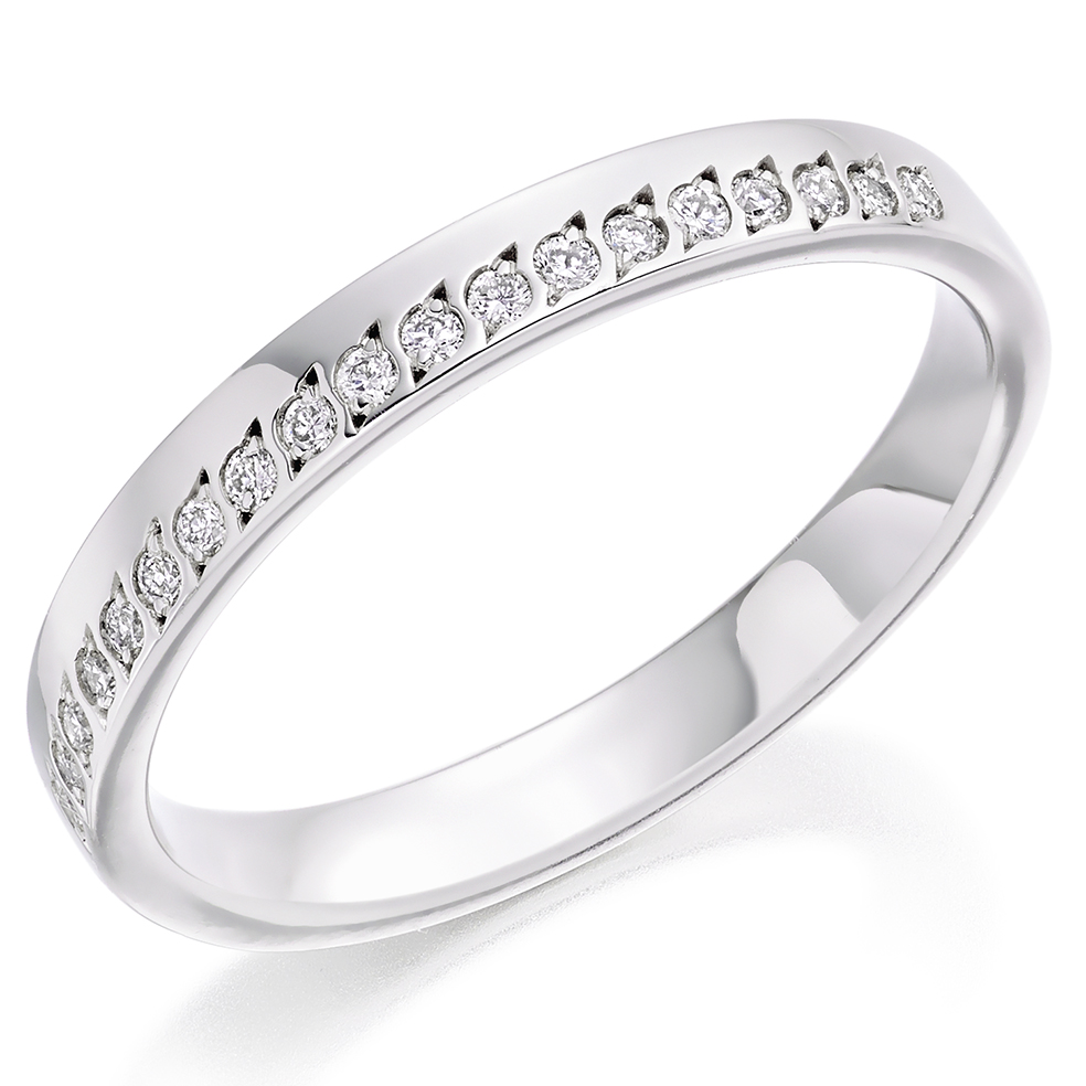 Ladies Offset wedding Band With Round Brilliant Cut Diamonds Set In a Grain Setting.