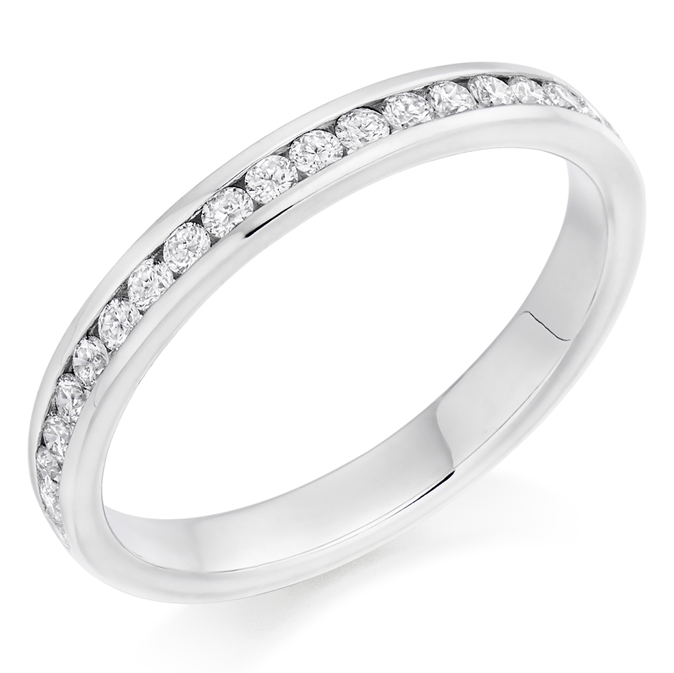 Ladies Platinum Diamond Wedding Band With Channel Set Round Brilliant Cut Diamonds.