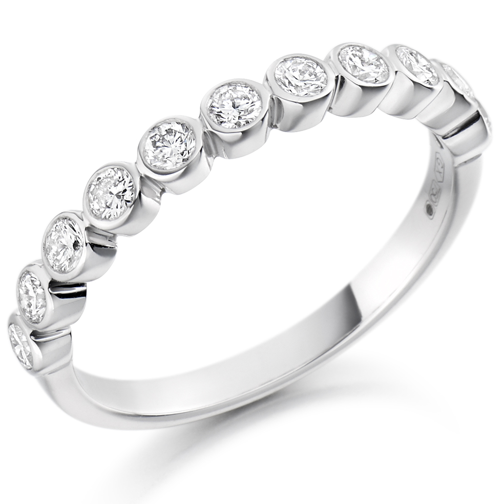 Ladies Platinum Wedding Band With Round Brilliant Cut Diamonds Set In a Rubover Setting .