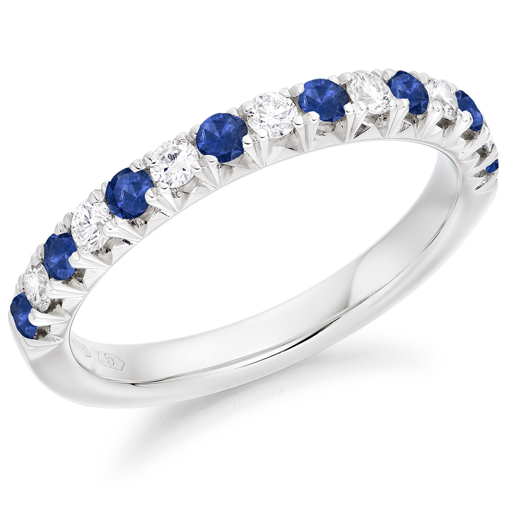 Ladies platinum half eternity band with round brilliant cut diamond and sapphire stones.