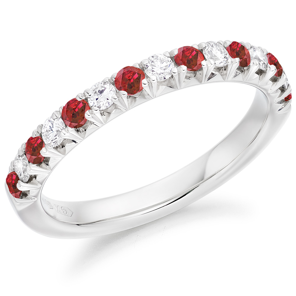 Ladies platinum half eternity band with round brilliant cut diamond and ruby stones.
